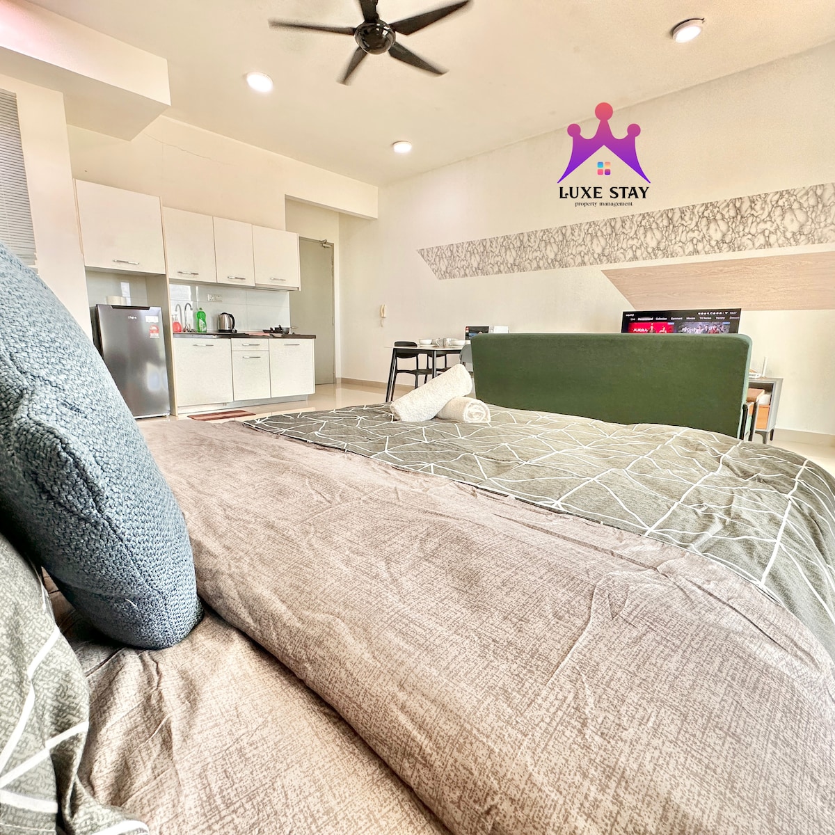 La nostra suite d'un dormitori, elegant i ecològica, a Kanvas SOHO, Cyberjaya, és perfecta per a parelles, escales o escapades de cap de setmana. A només 25 km de KLIA/KLIA2, i a poca distància de Tapak Food Truck, D'Pulze Mall, Burger King, KK Mart, cafeteries i molt més. 🛏️ Llit «queen size» i sofà llit Wifi 📶 d'alta velocitat 🎬 Netflix 🏊♀️ Mostra la piscina Accés a la sala🌇 VIP i al gimnàs 🅿️ Aparcament gratuït Accés 🚗 fàcil a l'autobús i a l'autopista Gaudeix d'una estada tranquil·la en un espai amb totes les comoditats modernes, en plena natura i a prop de la ciutat.
