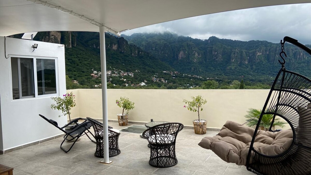 Aquest allotjament elegant està a prop de tot el que necessites amb detalls únics a causa del disseny de l'habitació, l'habitació, a part de tenir el que necessites per descansar, té un jardí a la teulada, així com una vista increïble de tots els turons de Tepoztlán, incloent-hi l'emblemàtic turó de Tepozteco, es troba a 5 minuts de la zona per caminar.