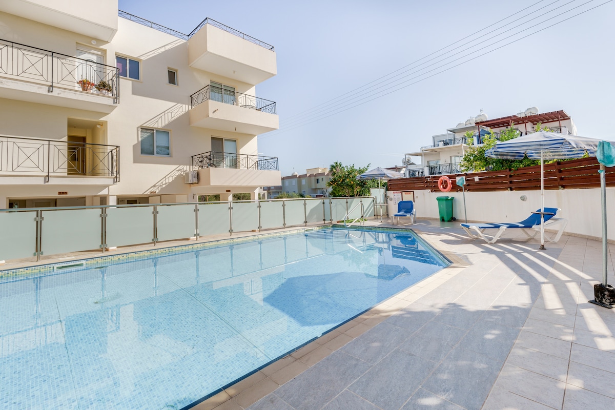Ampli apartament de 2 dormitoris (4 llits/1 cuna) en planta baixa amb jardí privat (80m2), pàrquing privat i piscina comunitària amb vestuaris. A poca distància de la platja (800 m) i dels serveis de Kapparis, a 5 minuts en cotxe del centre de Paralimni i a 10 minuts en cotxe de la famosa franja de Protaras, amb les seves espectaculars platges de sorra blanca (Fig Tree Bay). A 15 minuts en cotxe del popular Ayia Napa i a només 40 minuts en cotxe de l'aeroport de Larnaca.