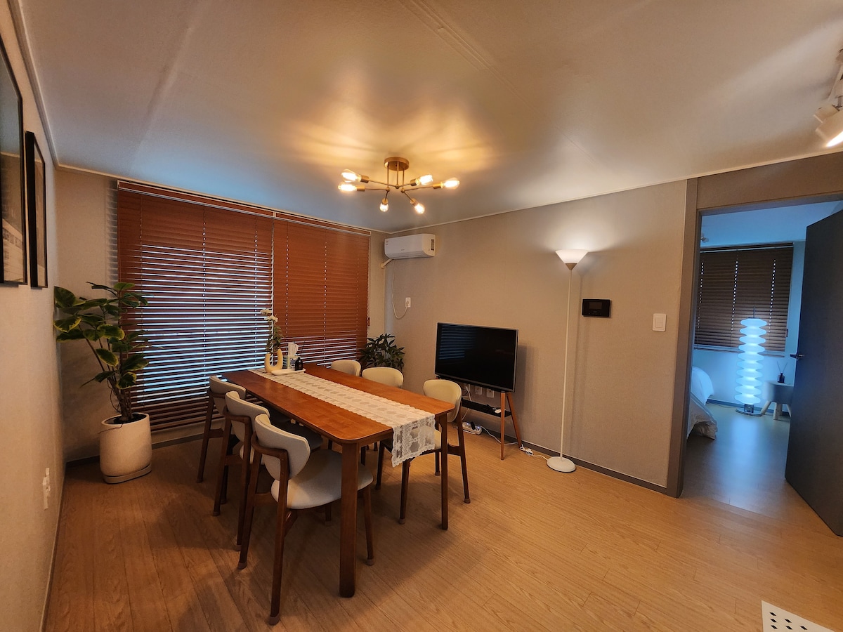 “지금, 여기서 행복하시길 바라는 진심”을 담아 청결하게 운영합니다. 짐보관 무료 서비스 제공합니다. [숙소 소개] - 숙소 1층 무료 주차 - 엘리베이터 있음 - 각 방 에어컨 총 3대 - 공원뷰의 도심속 힐링 숙소(+고요함) - 방2[침대4개(3Q+1S)]+넓은 거실+욕실1 - 고급 원목 2층 퀸침대 - “안방” 대형 스크린 빔프로젝터 - “거실” 스마트 TV - 6인용 대형 식탁 - 고급 화장대 + 스튤 2개 - 암막 커튼 - 아기자기한 홈스타일링 이쁜 포토존 - 반려견 동반 가능(추가금 발생) [ 교통편] - 대전역에서 1호선 탑승 1개 정거장 중앙로역 도착 후, 2번 출구 도보 7분 - 대전역 KTX에서 도보 15분 [물품] - 호텔 침구(고온 살균) - 수건(고온 살균) - 드라이기 2대 - 비데 - 샴푸/바디워시/컨디셔너/치약 - 온냉수 정수기, 전자렌지, 그릇, 냄비, 후라이팬 - 세탁기 [8인이상 숙박시] - 8인부터 퀸토퍼 침구 제공