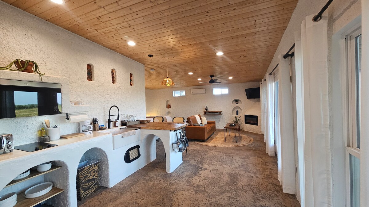 La nostra caseta està construïda amb fusta antiga i portes que es van trobar a la granja. Com que soc una persona molt freda, vaig instal·lar terres i un tovalloler escalfats, a més de l'aire condicionat i la llar de foc elèctrica. La caseta està envoltada de pastures que són la llar de les nostres vaques, cavalls, cabres, porcs i pollastres. El més destacat d'una estada a BWJ Cabin seria asseure's al porxo davanter en una balancera, un llit de dia o una banyera d'hidromassatge amb vista al paisatge i no fer res.