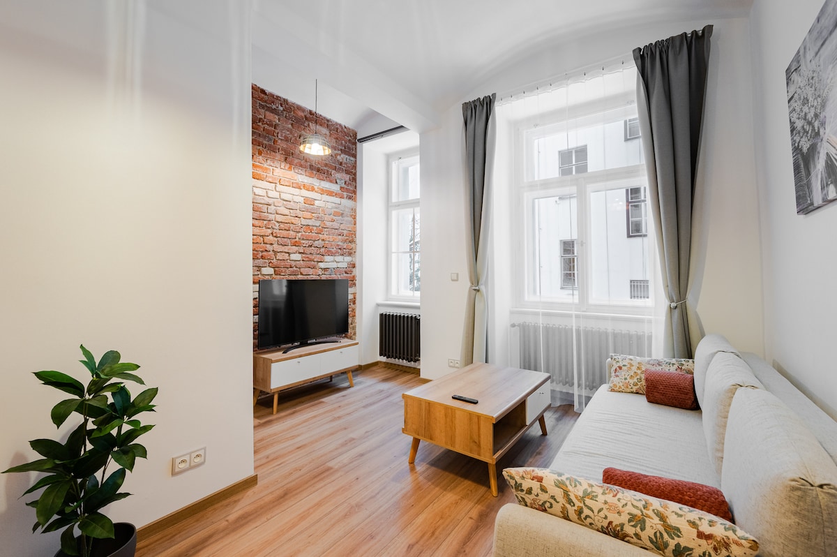 Un apartament nou i de luxe d'un dormitori en un edifici històric recentment reformat al centre antic de Praga. L'apartament té un interior molt modern combinat amb elements clàssics de fusta. Hi ha un dormitori tranquil amb llit doble i un matalàs d'alta qualitat, una cuina totalment equipada, una sala d'estar còmoda amb un sofà llit i un bany independent. Internet ràpid. L'apartament és perfecte per a dues persones, però allotja còmodament fins a quatre hostes. L'edifici disposa de recepcionista les 24 hores i seguretat de servei.