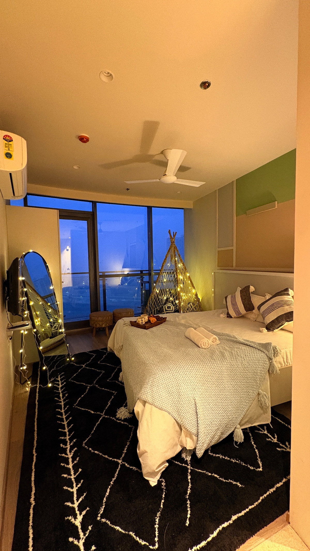 Above the city on the 10th floor, it's your 1 BHK studio that believes in two things: good vibes and great views. Wrapped in greens, soaked in height, and styled to relax, this is your private escape between Dwarka & Gurgaon super close to the Delhi International airport. Perfect for couples, tourists, corporate knights, staycations or meetups.