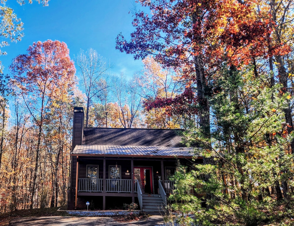 Bungalou de vidre que convida la natura a entrar, situat en un bosc i a 10 minuts de Dahlonega. Llits «QUEEN size» amb matalàs amb coixí i roba de llit de luxe. Sostre de ranura i llengüeta amb llar de foc de pissarra, fogar, bany amb dutxa de pissarra, tovalloles de peluix. Electrodomèstics de cuina d'acer inoxidable, placa de vidre, forn, rentavaixella, microones, torradora, nevera, estris, estris de cuina i cafetera Keurig. El nostre pati exterior amb graella t'espera. Televisor de 43 polzades amb ROKU i Disney, Hulu, Max, Netflix i Paramount. Llicència per a lloguers de curta durada #4829