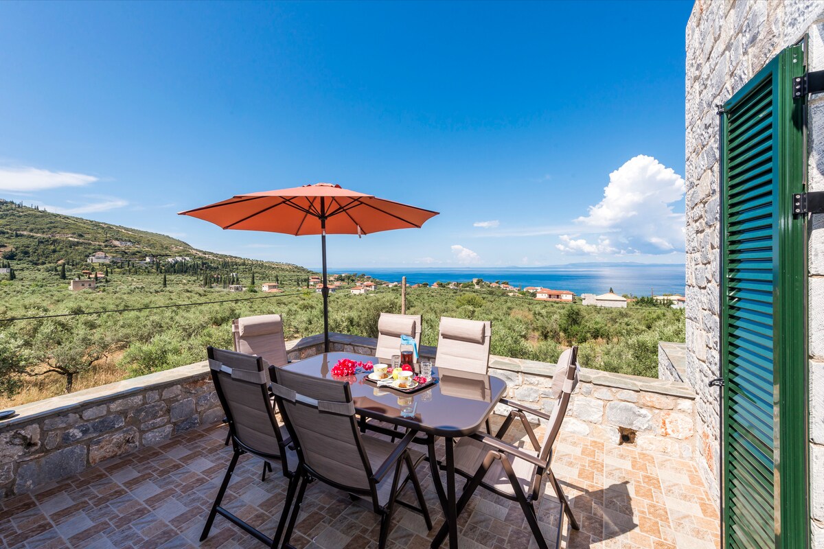 El xalet es va construir el 1928 amb pedra local de Pelion i té un disseny arquitectònic especial i va ser completament renovat (2016). La vista és impressionant i l'interior de la casa compta amb el romanticisme d'una altra època amb totes les comoditats modernes. L'allotjament té dues plantes i un jardí (1000 metres quadrats).