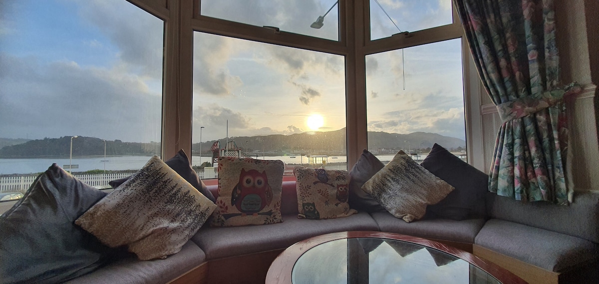 Fabuloses vistes a l'estuari de Conwy i les muntanyes més enllà. Luxós i espaiós allotjament per a 2 persones a la planta baixa: entrada privada a la planta baixa. Llit «king size», bany/dutxa moderns, totes les comoditats de luxe a mà. Gaudeix de les vistes de Conwy al còmode sofà i la gandula de disseny. Televisor intel·ligent de 55 polzades amb Netflix i Amazon Prime. Banda ampla ràpida de 150 mbps per treballar des de casa. Pren una beguda romàntica al pati i gaudeix de les vistes canviants. Prepara un àpat a la cuina totalment equipada o menja als restaurants locals.