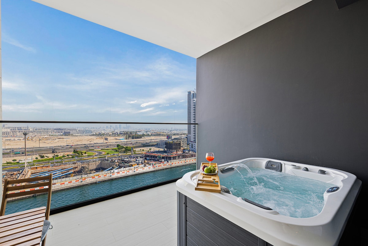Amazing infinity pool & Spa Accommodates up to 4 persons. king bed + sofa Bed (queen) Hotel Grade amenities include: Pool, Gym, Spa, salon, kids pool, coffee shop & more. This studio apartment is located in the heart of Business Bay, Downtown Dubai, with breathtaking views of Dubai Water Canal and partial views of Burj Khalifa. It is also within walking distance of Dubai Mall, the world's largest shopping mall. The apartment is equipped with everything you need for a comfortable stay.