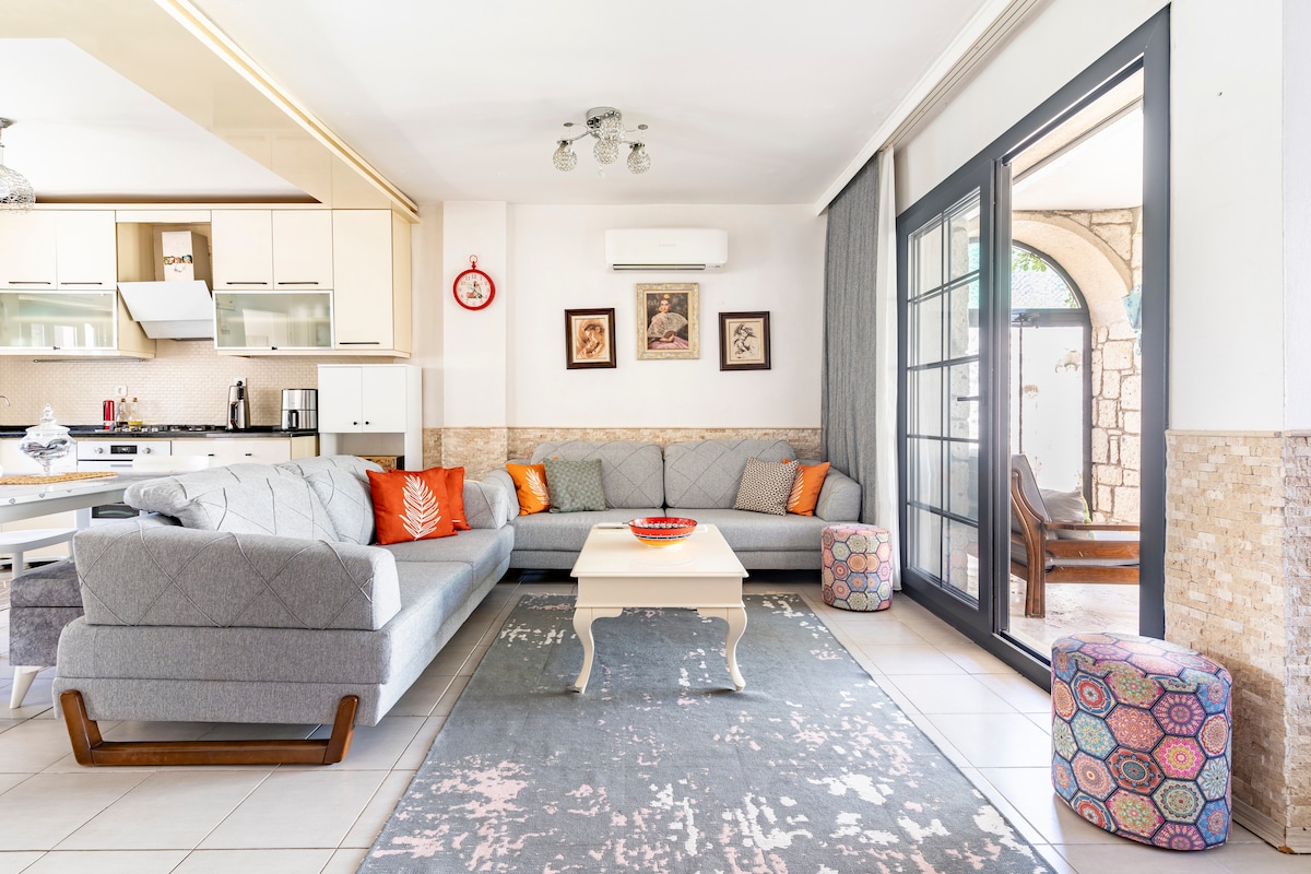 La nostra vil·la està situada al centre d'Alaçatı, a 4-6 minuts a peu del mercat del poble, amb aire condicionat, sense problemes d'aparcament, fàcil d'arribar, a prop dels supermercats (Şok, A101, Migros, Macrocenter). Una sala d'estar àmplia i espaiosa, 3 terrasses àmplies a la part davantera i posterior, un llit doble i un llit individual en un dormitori al 2n pis, un llit doble a l'altre dormitori, un bany principal i una terrassa pròpia. Pots triar-la per a unes vacances tranquil·les, plàcides i tranquil·les lluny de la multitud d'Alaçatı.