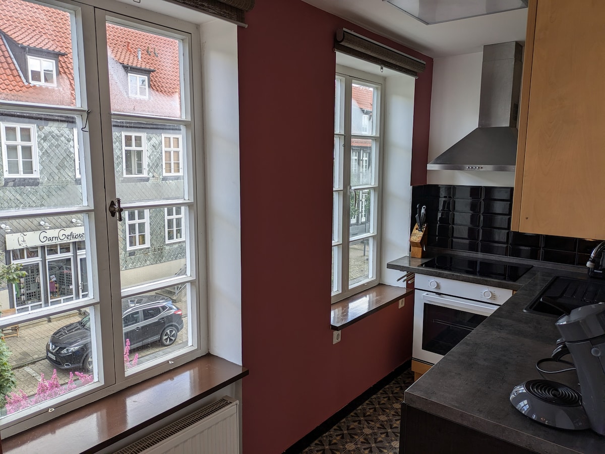 Pis elegant (uns 40 m2) a la primera planta d'una casa històrica de fusta de 1750, molt acollidor i cèntric (a 1 minut del mercat/zona de vianants), totalment equipat, EBK amb rentaplats, forn i microones. Acollidor menjador, llit d'1,40 m, televisor intel·ligent amb recepció per satèl·lit, rentadora i assecadora al soterrani, wifi amb 50 MBit/s. Els millors preus especials per a estades més llargues, només has de sol·licitar els períodes que vulguis!