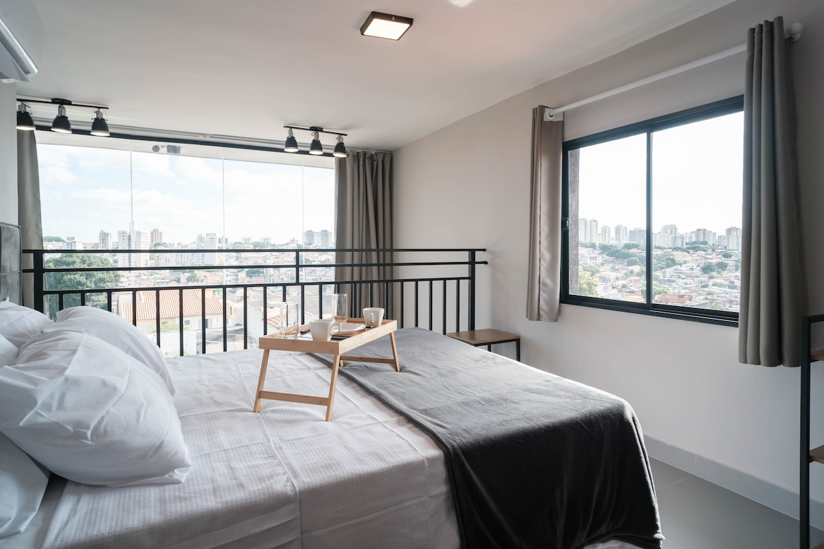 LOFT ÚNIC I EXCLUSIU! Completa amb 2 balcons! A 5 metres de peu dret! Una vista impressionant! *** Llit «QUEEN SIZE» + sofà llit DOBLE. Cuina completa, oficina a casa amb wifi, televisor intel·ligent de 50" i llit complet i roba de bany. Roba de llit i tovalloles de bany. Mercadinho i sala d'espera a la planta baixa! * A 5 minuts en metro. * 10 min SP Expo Imigrantes * 11 minuts de compres a la Plaça Sul. * A 13 minuts de l'aeroport de Congonhas. * 30 minuts d'Interlagos * A 10 minuts del Centre Paralímpic. * 25 min Vibra SP * A 7 minuts del CEIC Itaú. Temps mitjà