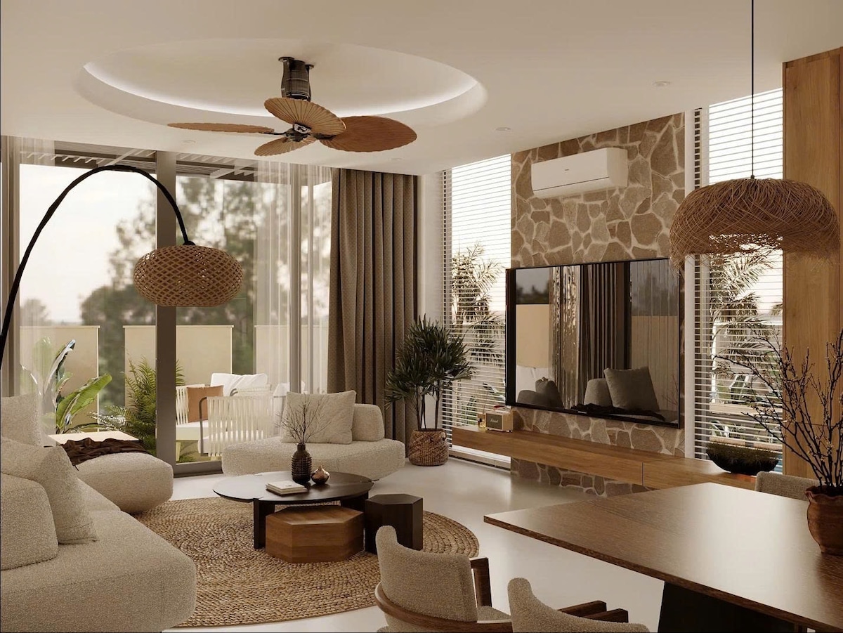 El 3-BDR Apartment és un testimoni de l'estètica mixta Wabi-Sabi i Boho, que celebra la bellesa de la senzillesa, la imperfecció i la natura. El disseny interior presenta una paleta relaxant de blancs pàl·lids i grocs (estil de Hoi An) , complementats amb la natura , creant un entorn serè i harmònic. El nostre objectiu és oferir un refugi tranquil on els hostes puguin relaxar-se. Tot i la seva mida compacta, el mini rebost, 3 llits «king size», banys privats i un jacuzzi amb vista al riu a l'exterior.