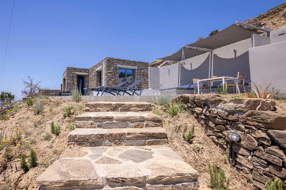 Entra en una casa tradicional ciclàdica de revisió única i situada a la vora del poble de Ktikados. Deixa les maletes, obre les portes dobles que condueixen al pati i instal·la't amb una vista amfiteàtrica de la muntanya i el mar. La propietat consta d'una sèrie de terrasses ideals per menjar al aire lliure, descansar i gaudir d'unes vistes incomparables de la posta de sol. Durant el dia pots esperar fly-bys dels cuervos locals únics de l'illa i després de la posta de sol, les visites a la llum de la lluna de les ovelles de la vall.