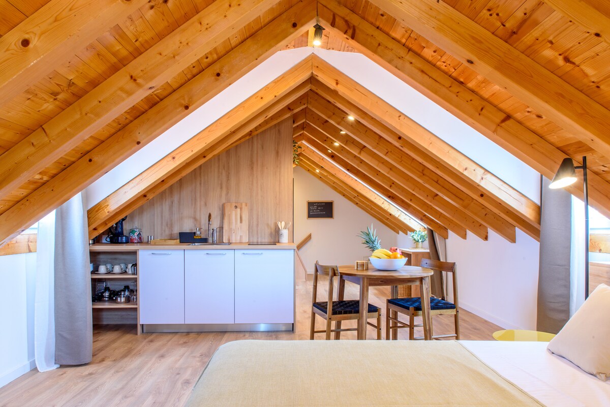 Desperta't sota les bigues vistes de sostres de fusta centenària. Deixa't impressionar pels tocs antics, les escales d'estil industrial i els acabats elegants darrere dels enormes arcs interns de pedra del Palau Imperial. Emplenat d'història i beu una copa de vi des del balcó d'aquest loft únic després d'explorar les delícies de Split, on les peces del museu adornen una paleta de sorra i tons silenciats i terrosos.