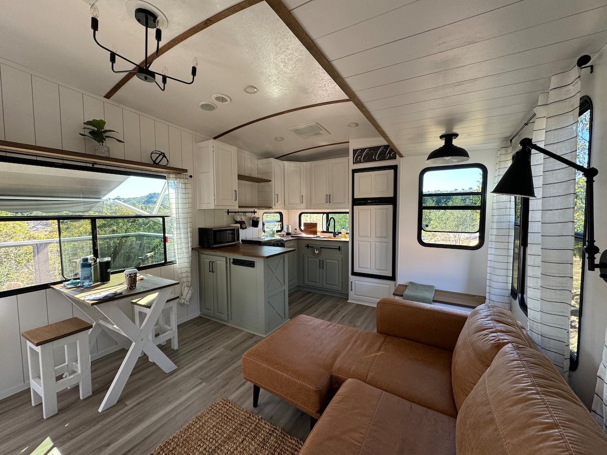 Glamping🌟 Desconnecta i relaxa't en un entorn tranquil amb unes vistes impressionants a la muntanya i unes albes i postes de sol inoblidables. A la nit, podràs contemplar el cel ple d'estrelles, una de les característiques més màgiques de la zona. El teu refugi privat t'espera a «Serenity», un Airstream de 30 peus molt ben equipat. Passa els dies descansant en el sofà llit del tipi o gaudint de la banyera d'hidromassatge mentre observes les estrelles sota el cel obert. Quan es faci de nit, relaxa't amb una copa de vi al costat de la llar de foc a la nostra àmplia coberta flotant.