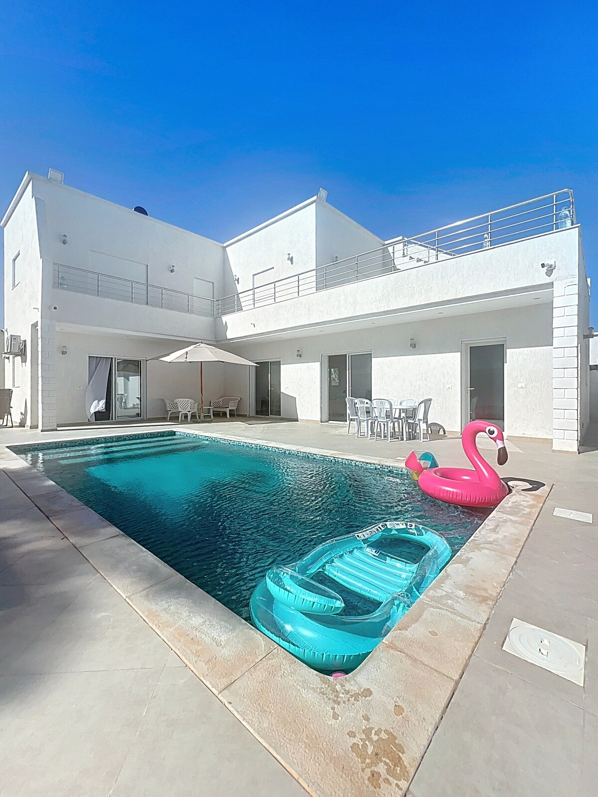 Vil·la amb piscina privada sense vis-à-vis 🏝️ a Djerba Midoun. 3 dormitoris elegants 🛏️, incloent-hi una suite amb llit king size i televisor📺. Cuina totalment equipada 🍷 (forn, microones, plats, rentadora🧼), aire condicionat❄️ 📶, wifi, llençols inclosos🧺. Exterior ordenat amb gandules ☀️ i mobles de jardí🌴. A 5 minuts en cotxe de la platja🏖️, zona turística🎯, a 25 minuts de l'aeroport✈️. Bressol per a nadons 👶