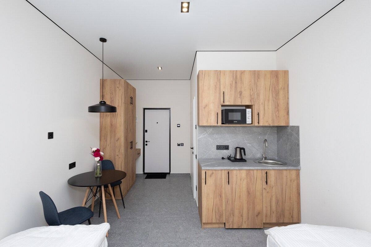 Двокімнатні апартаменти на 4 особи (двомісне ліжко та два одномісних). У апартаментах є міні кухня, посуд, холодильник, кондиціонер, тепла підлога, пральна машина - все необхідне для комфортного прибування у готелі.Це стильне, нове помешкання розташоване неподалік від туристичних принад у центральному районі міста