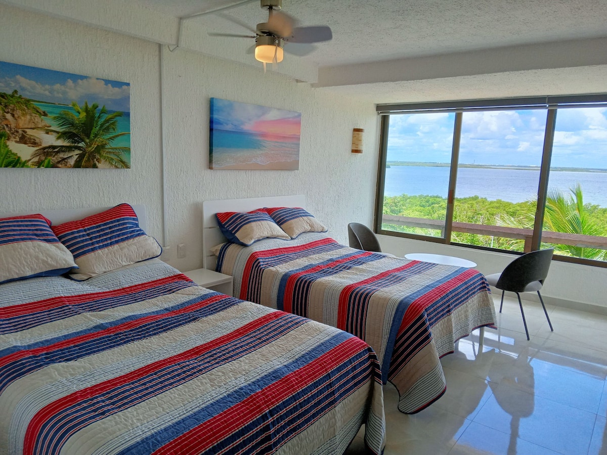 Acollidor pis a la millor zona de Cancún, molt a prop de restaurants, discoteques, supermercats, camps de golf. Tenim accés a una platja privada, l'ús de la piscina i les gandules està inclòs. La vista des de l'habitació és increïble A prop de l'aeroport, que ens permet ser un lloc on allotjar-nos en vols de connexió, sense preocupar-nos pels trasllats a la Riviera. Ideal per a persones que busquen un bon descans, unes vistes precioses i treballar a distància! Llunes de mel❤️