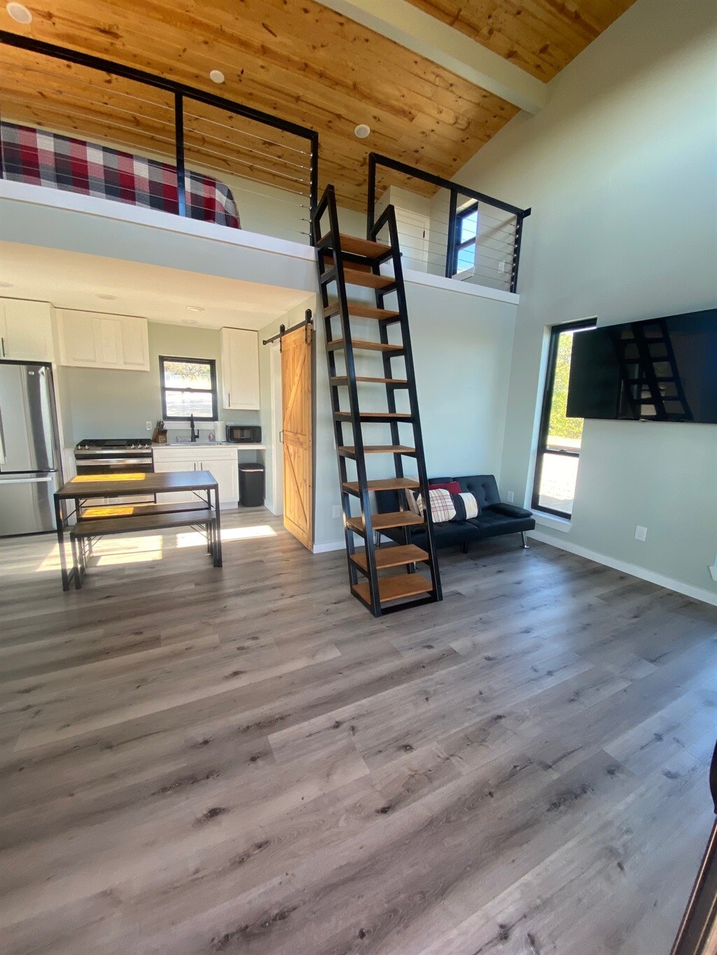 Convenient in town location. Enjoy the vaulted living room area, one bedroom, one bath villa decked out in an industrial décor, from reclaimed boxcar flooring wood countertops with steel trim to sliding barn doors. Everything you need to make your stay in Sulphur pleasant as possible at a budget friendly price. You are close to Chickasaw Recreation (Platt National Park) area, a unique downtown, arts centers and casinos as well as multiple fine restaurants.