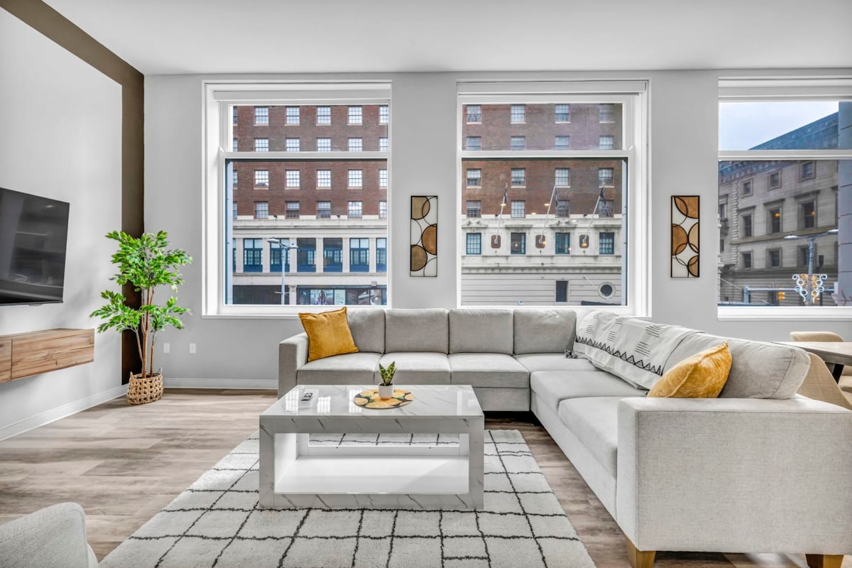 Et donem la benvinguda al teu espai preferit! 😎 Allotja't en aquest loft fantàstic i divertit al cor de Downtown Cleveland! Els sostres alts, les finestres enormes i la llum del sol que entra per elles creen un ambient especial des del primer moment. Dissenyat amb tocs retro i alegres, aquest espai té una energia que et fa sentir feliç. Gaudeix d'un llit «king size», dos televisors intel·ligents i una cuina totalment equipada. Els avantatges de l'edifici inclouen un gimnàs, una sauna i un aparcament subterrani segur.