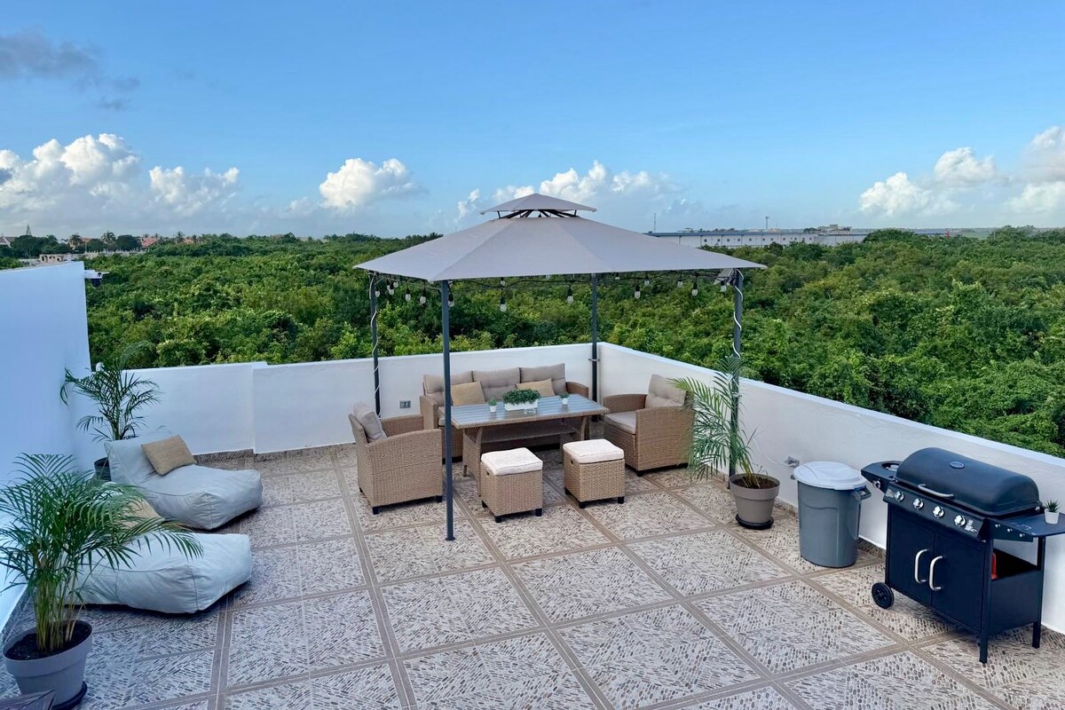 Gaudeix d'una estada acollidora en aquest allotjament de 3 dormitoris i 3 banys al centre de Punta Cana. Equipat amb aire condicionat, wifi d'alta velocitat, 2 televisors intel·ligents i una terrassa privada amb una barbacoa (sense aigua calenta), ofereix l'equilibri perfecte entre comoditat i conveniència. La cuina totalment equipada, l'aparcament segur, la seguretat les 24 hores i la gran piscina comunitària garanteixen una experiència perfecta. A només 3 minuts del centre de Punta Cana i COCO BONGO, a 12 minuts de l'aeroport i a 15 minuts de la platja. Reserva ara!