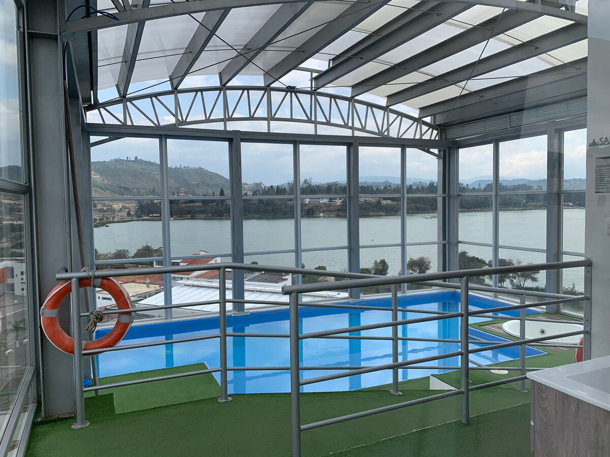 Exclusivo apartamento a orillas del lago Sochagota,podrás disfrutar de un espacio de lujo completamente nuevo,pensando en el bienestar y tranquilidad de nuestros huéspedes, con detalles locales y amenidades tecnológicas, como: cerradura y parlante inteligente , lámpara y televisor con asistente de voz, calefactor, y un bello balcón con vista lateral al lago. Encontrarás descanso, lujo y contacto con la naturaleza, todo en un solo lugar.