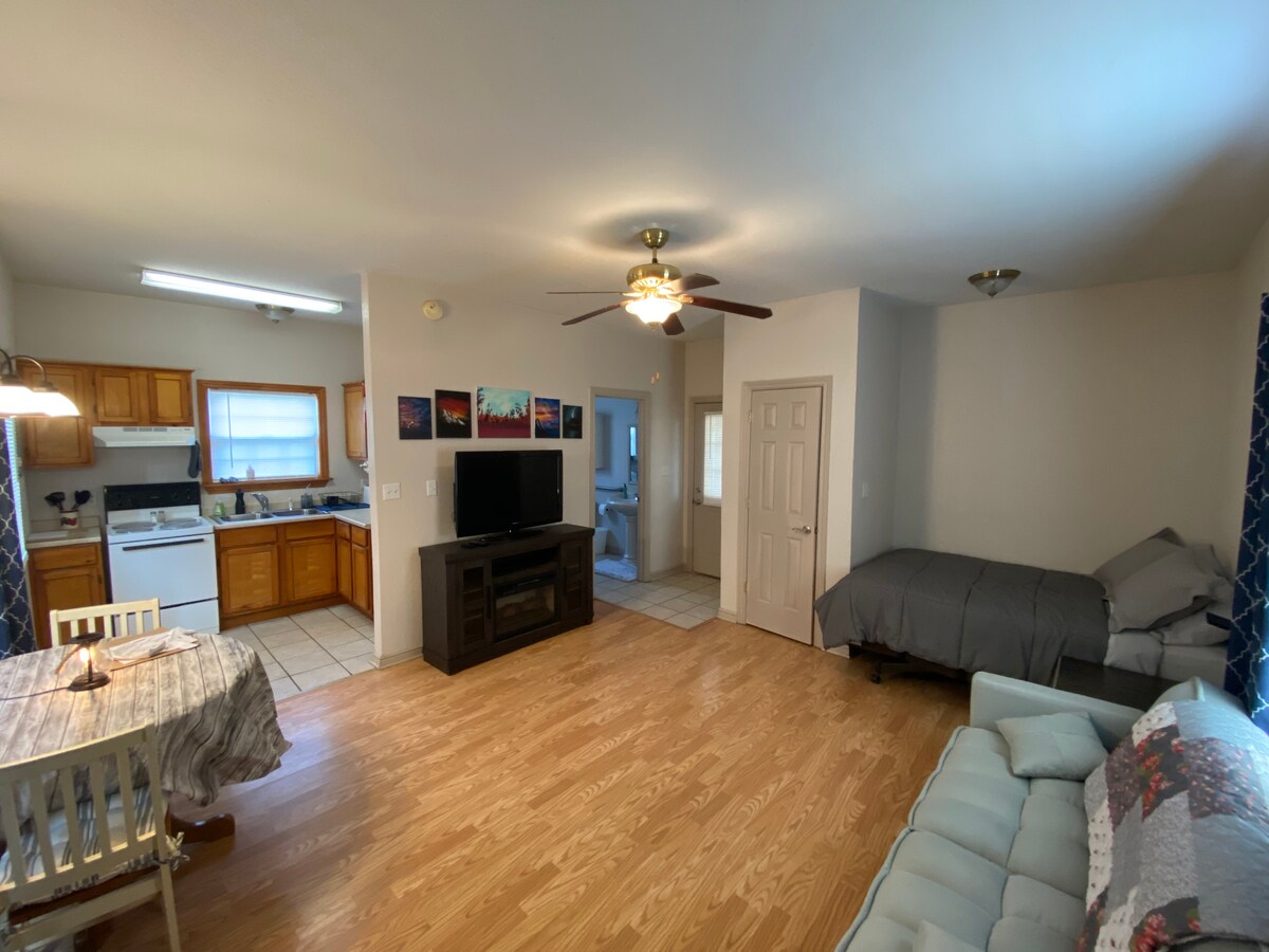 Studio Z és un allotjament modern i natural situat en un antic hàbitat familiar de nogueres. Retira't al teu estudi al bosc, a només uns moments del Choctaw Casino i del llac Texoma. Accés ràpid a l'autopista. Gaudeix d'una cuina completa, un llit «king size», un porxo privat, una entrada privada a l'estudi que hi ha a sota de casa nostra i una propietat tancada segura. Prepara't per a una cita nocturna, ideal per treballar a distància, per un concert a Choctaw o simplement per relaxar-te. Wifi ràpida. Entorn tranquil a prop d'equipaments i serveis moderns. Perfecte per a professionals sanitaris i estades de mitjana durada!