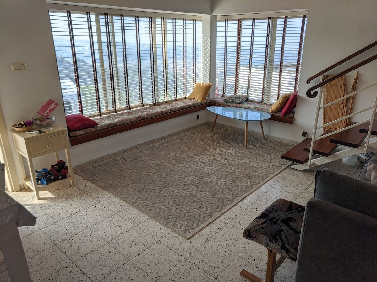 L'escapada de vacances perfecta amb una vista extraordinària al mar de Benín, la vall del Jordània, les altures del Golà i les muntanyes de Gilead. La nostra localització és un lloc ideal per visitar llocs històrics i turístics, i embarcar-se en boniques excursions i aventures a la regió nord d'Israel. A deu minuts en cotxe hi trobaràs botigues, restaurants i cafeteries. Gaudeix del pis tranquil i relaxant i refrescant-te amb la bella creació de Déu!