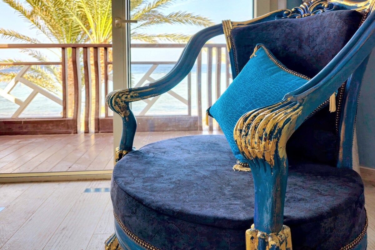 Un exclusiu àtic de 2 habitacions davant de la platja amb terrassa privada, just a la costa de la zona d'Asala. A només 5 minuts a peu del mercat d'Asala, el principal mercat local de Dahab amb totes les botigues. L'inici del passeig turístic (extrem nord) també és a 5 minuts a peu de la platja. Nota: A causa de l'alta ocupació, no és possible fer arribades anticipades ni sortides tardanes, ja que cal temps perquè estigui impecable. Tingues en compte això abans de fer la reserva. No obstant això, podeu deixar les bosses.
