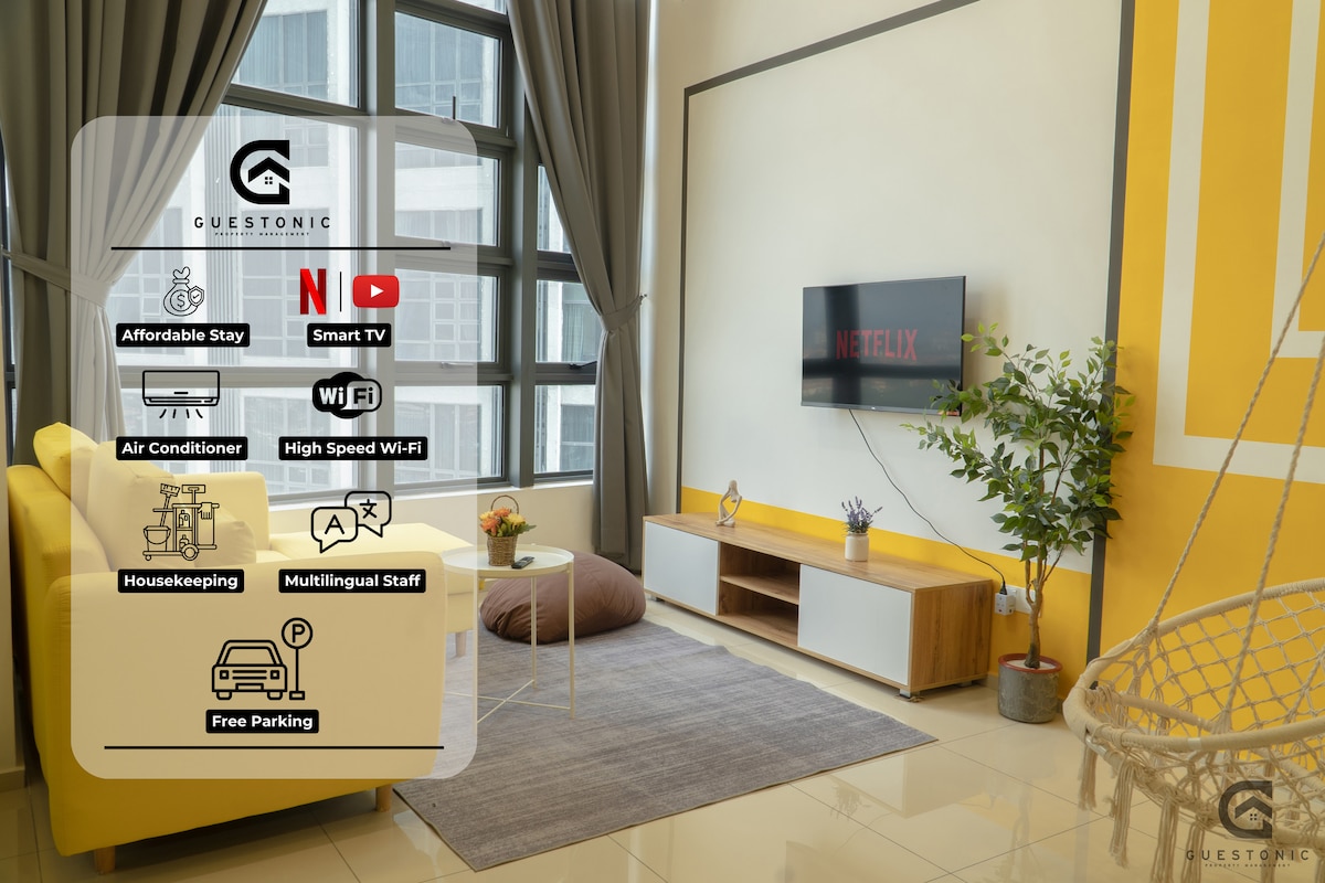 Welcome to our modern industrial-themed duplex, where urban comfort meets chic design. This unique space is ideal for up to 6 guests, providing a stylish and comfortable stay. Step into an industrial-inspired haven with exposed brick walls, sleek metal accents, and contemporary furnishings. The design is both trendy and cozy, creating a welcoming atmosphere. It direct access to EKO CHERAS MALL and link to MRT Station. A charming selection of cafes, bars, restaurants, and retail shops.