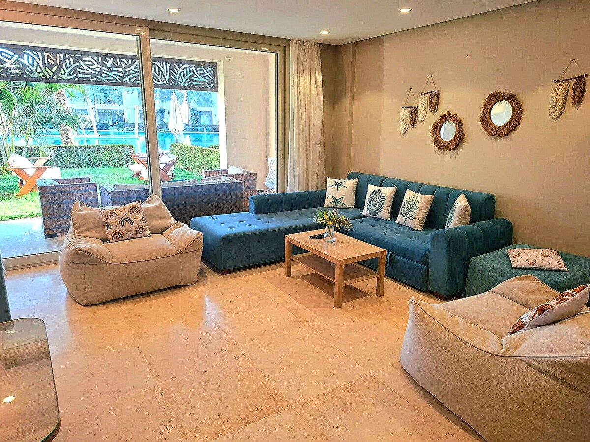 Pis elegant de 2 dormitoris al cor d'El Gouna. La preciosa piscina es troba directament dins del complex, a pocs passos, i la platja privada i la llacuna són a només 6 minuts a peu. Ideal per a una estada tranquil·la en família, amb amics o en parella. *L'espai* 2 dormitoris 2 banys Balcó privat Cuina totalment equipada Aire condicionat a totes les habitacions Màquina d'espresso De'Longhi Rentadora Wifi ràpid Caixa forta Smart TV amb opcions de streaming A prop de Marina, Downtown i Kafr Entorn tranquil i verd