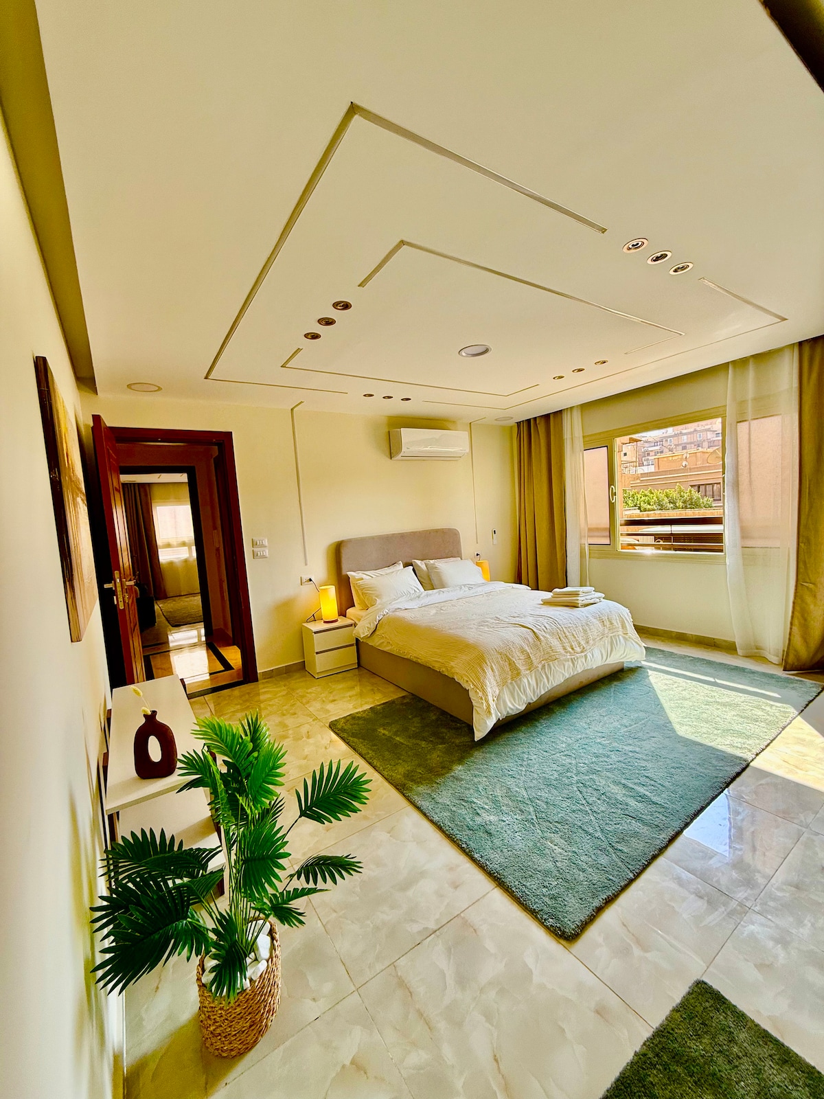 Oasi lluminós a prop de l'aeroport internacional del Caire Aquest pis a l'últim pis, situat a pocs minuts de l'aeroport en un dels barris més segurs del Caire, ofereix tranquil·litat. Tot i que no hi ha ascensor fins al quart pis, val la pena pujar-hi per gaudir de les impressionants vistes des de la teulada i d'un ambient tranquil. El pis està totalment equipat per a la teva comoditat, amb un televisor intel·ligent 4K amb Netflix i Amazon Prime.