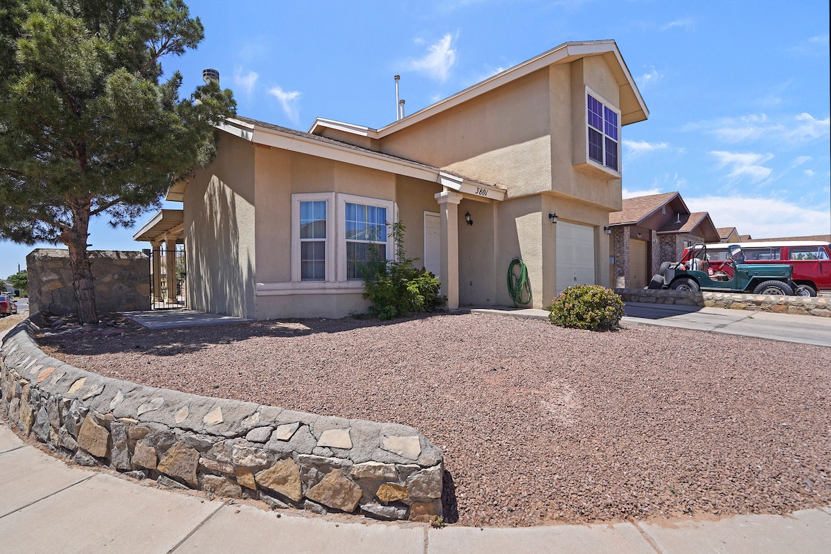 Relaxa't amb tota la família en aquest allotjament tranquil situat a minuts de botigues, restaurants i entreteniment. Amb un fàcil accés a les principals autopistes, pots visitar llocs emblemàtics de la zona, com ara Hueco Tanks, Ft. Bliss, l'històric Mission Trail i fins i tot Mèxic. Aquesta pintoresca casita està adornada amb una decoració inspirada en El Paso que et dona la benvinguda a relaxar-te i gaudir de les comoditats de la llar. Una cistella de benvinguda et dona la benvinguda amb aperitius i cupons a les empreses locals. Et donem la benvinguda a El Paso, Texas!