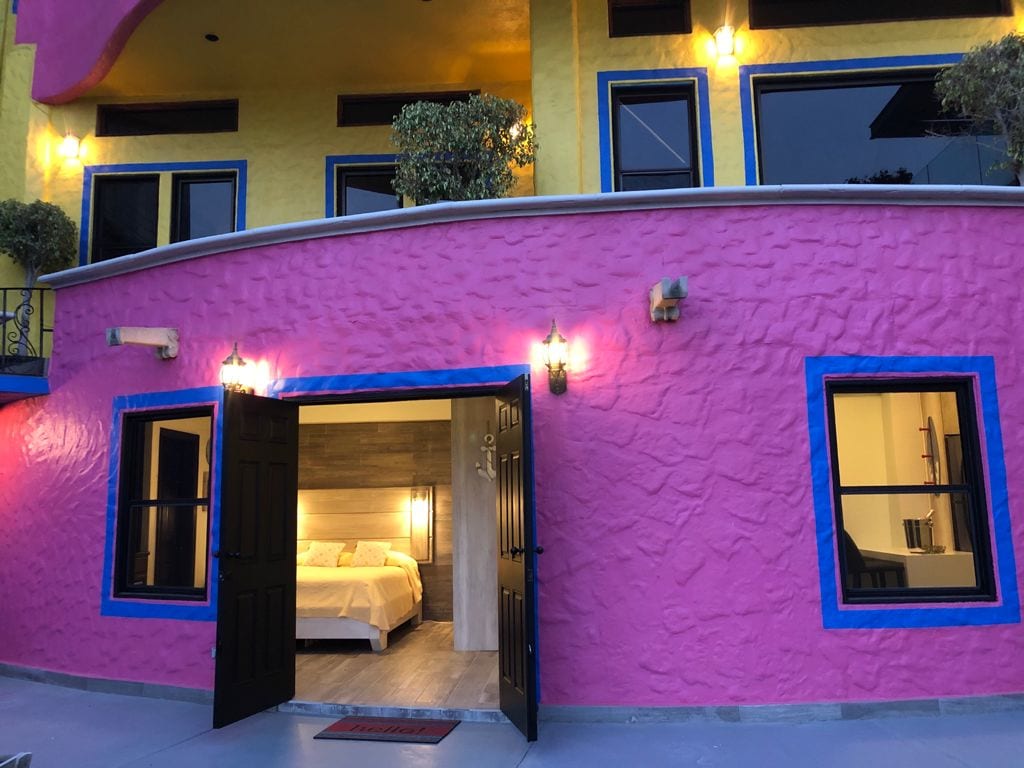 Vibrant apartament estudi nou dins d'una elegant finca mexicana d'estil Frida Kahlo a la qual s'accedeix a través d'un passeig amb 3 trams d'escales. Es troba a la planta baixa, davant del pati i el jardí. Tindràs un llit queen, televisor, bany complet, cuina completa i zona de menjador/escriptori/bar. Pots escoltar els ocells al matí i seure al tranquil pati envoltat de vegetació. En caminar fins a la terrassa del segon pis pots gaudir de les impressionants vistes de la ciutat i del port de ensenada.