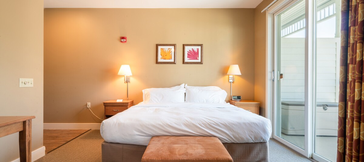 This spacious hotel room, located in our condominium building, has one king bed, a private bath, and a covered veranda. The room is approximately 275 square feet. Includes complimentary Wi-Fi, mini-fridge, and cable television. Limited on-site parking. Street parking is available. No smoking unit.