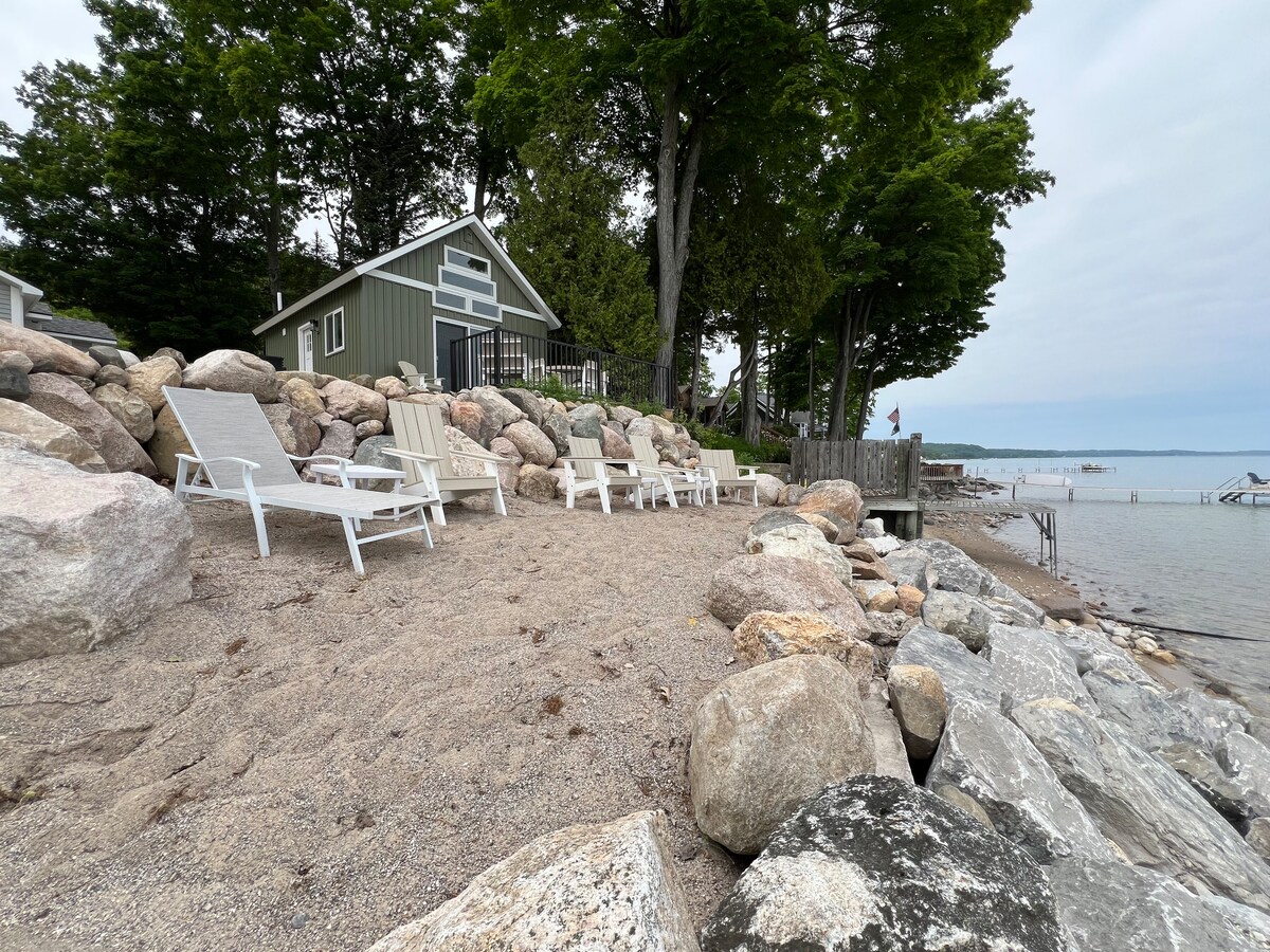 1940s beach side Inn looking to fulfill your vintage lake cottage dreams! We're on the west bay of Traverse City on M22. Your gateway to the villages of Leelanau and only 8 minutes from downtown. This listing is for a duplex style cottage. Want to watch the sunrise on a private beach? A midnight swim in Lake Michigan? Come stay at the vintage Anchor Inn and feel free to use our sauna, kayaks, firepits, beach chairs, firewood, charcoal grills, playground, cornhole, e-bike rentals, and much more!