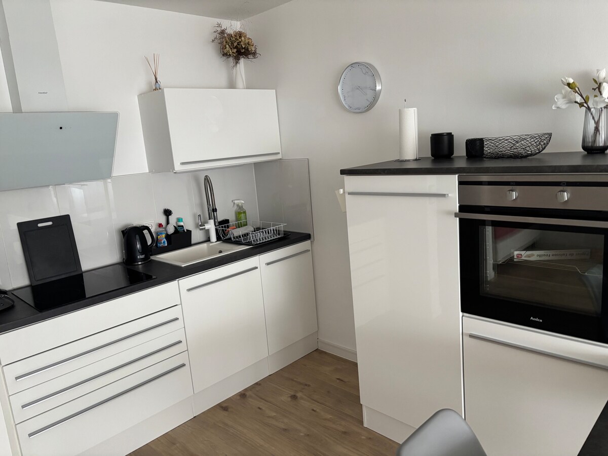L'apartament es troba a la planta baixa i està completament reformat el 2021. Amb una mida de 66m², ofereix espai suficient per a tres persones per passar les vacances en un ambient agradable. Un llit addicional i l'ús d'una gran propietat de jardí a prop ( 15 minuts a peu) són possibles a petició. Aparcament gratuït davant de la casa o just enfront. Les botigues, com ara els carnissers i el mercat de xarxes amb sucursal de fleca, es troben a 2-5 minuts a peu.