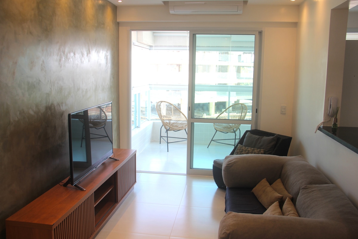 Apartament de 60 m2 amb aire condicionat i piscina, ideal per a un viatge tranquil en família, amb amics i mascotes. A 7 minuts de la platja d'Enseada i a prop de la platja de Pitangueiras. Accés gratuït a la piscina i barbacoa al terrat, zona d'esbarjo i parc infantil. L'apartament està ben situat i es troba a l'avinguda principal, a prop de mercats, restaurants, fires i platges L'apartament disposa de: - Aparcament privat - Estris de cuina - Ventiladors. - Aire condicionat. - Wifi
