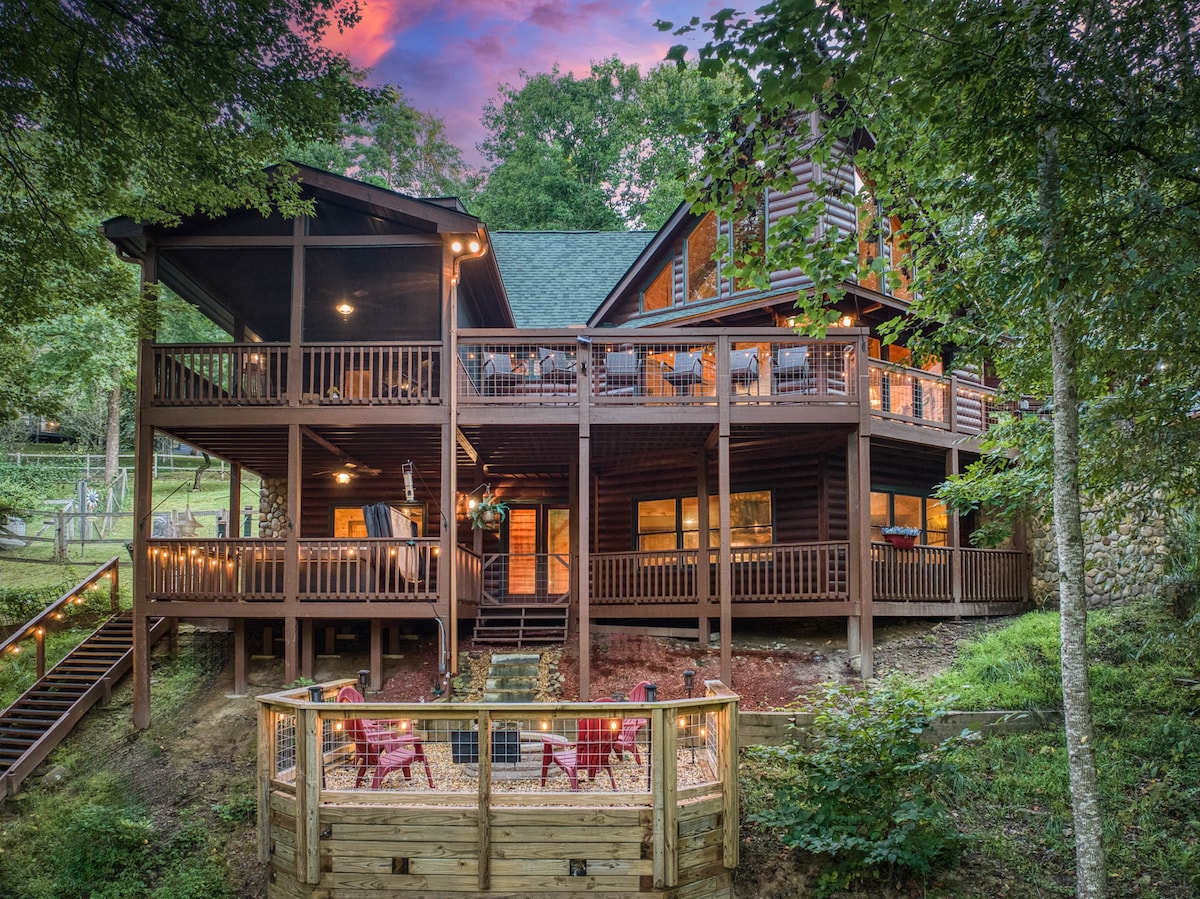 The Bluff Haus és una escapada d'estil xalet a les muntanyes Blue Ridge que et porta de nou al que realment importa. Dues terrasses donen a un bosc exuberant i són coses dels somnis dels Apalaches. Des d'una sala d'estar a l'aire lliure fins a una banyera d'hidromassatge i llums de corda brillant, les nostres cobertes són una destinació de vacances en si mateixes. A l'interior, aquesta nova casa t'inspira i et converteix en dues plantes amb un ambient de masia, molts serveis i grans finestrals amb vistes als arbres.