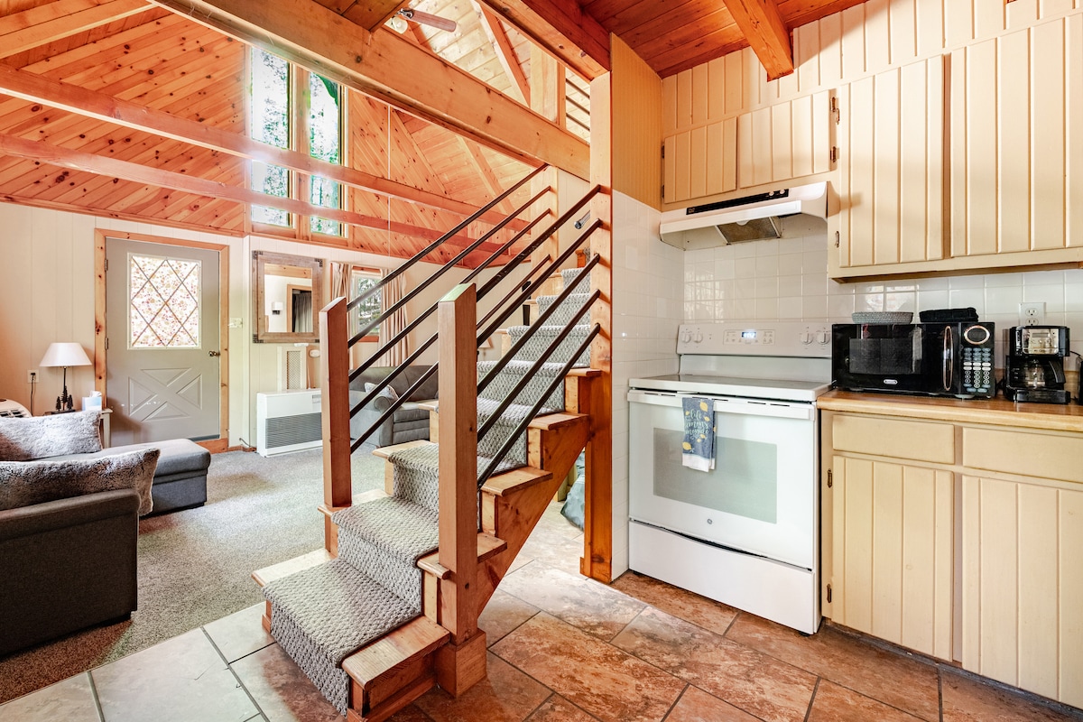 El nostre estudi és un espai privat de 750 peus quadrats situat en un terreny boscós a només 1,5 milles del poble. La Sandy i jo ens enorgulleixem d'oferir un espai net, ben proveït, tranquil i privat. Hi ha una cuina completa amb microones/forn de convecció, nevera gran, estris de neteja, llar de foc elèctrica, torradora i cafetera Keurig amb càpsules K-Cup per a cada persona i moltes coses més. Es proporciona tota la roba de llit amb moltes tovalloles addicionals. 2 places d'aparcament disponibles 2025-STR-0218