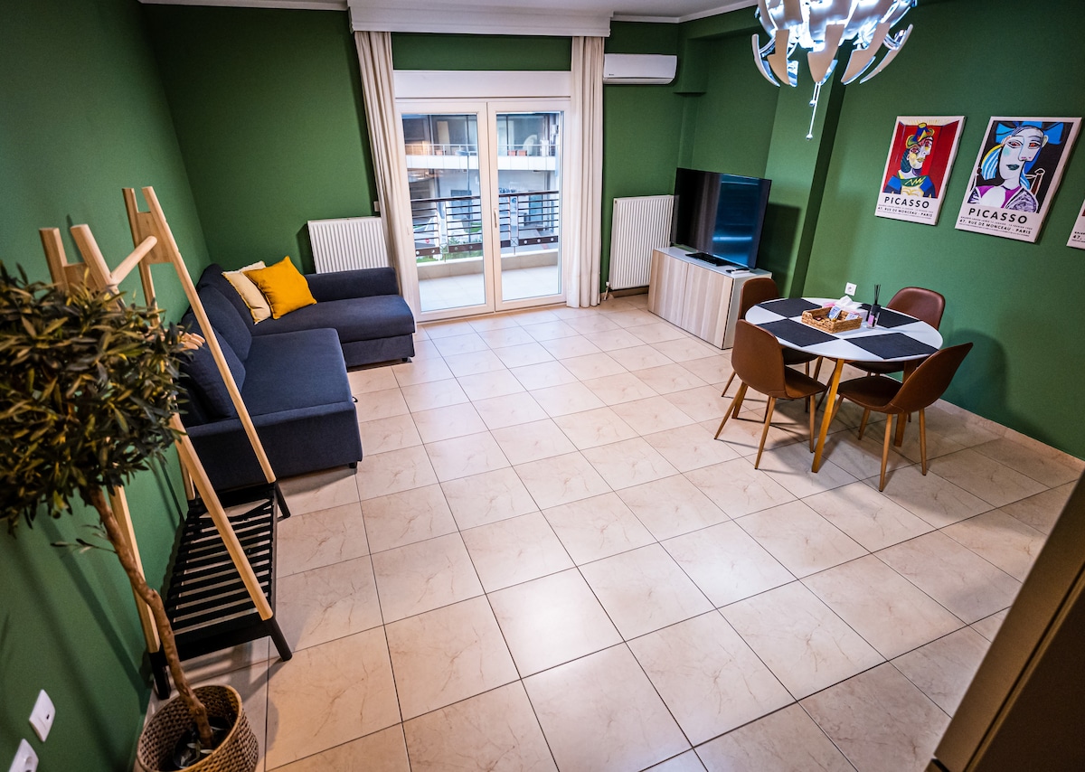 Gaudeix d'una estada relaxant al nostre apartament renovat (2024) i elegant situat a la vora del centre de Tessalònica. El pis es troba a poca distància a peu (10-15 minuts a peu) d'algunes de les zones més famoses de la ciutat. -1 km fins al barri de Ladadika (tavernes locals, restaurants, pubs i clubs) -1,2 km de la vora de l'aigua -1,5 km de la plaça Aristotelous (plaça principal de la ciutat) - A 350 m de l'estació central/parada de metro (Nova estació de tren - Νέος Σιδ. Σταθμός)/X1 parada d'autobús des de/ cap a l'aeroport