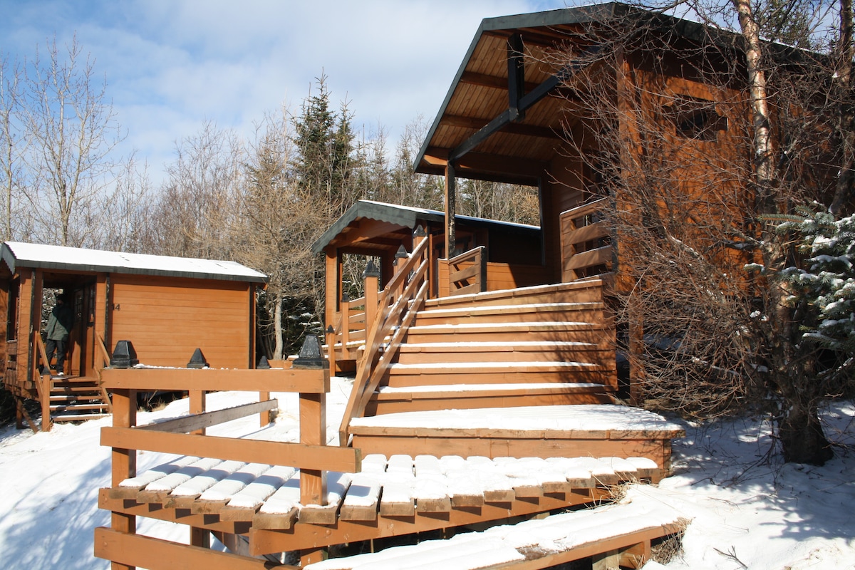 Les nostres casetes tenen llits fets, bany privat, dutxa exterior càlida i agradable i banyera d'hidromassatge (cal reservar-la amb antelació). Estan ben equipades amb cortines opaques, roba de llit i llençols de luxe. Cuina petita però totalment equipada i un petit porxo. Gaudeix de la tarda assegut a la terrassa contemplant les espectaculars muntanyes i del sol de mitjanit durant l'estiu. Per als visitants d'hivern, aquest és el lloc ideal per als esports d'hivern, les vacances familiars i per veure les aurores boreals.
