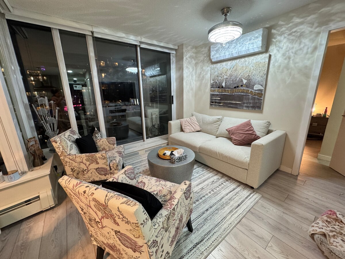 Apartament de 2 dormitoris bellament moblat situat al cor del centre de Vancouver. Gaudeix d'unes vistes fantàstiques mentre descanses i relaxa't a la teva àmplia sala d'estar. Estar al cor de la ciutat i tenir una puntuació de 100/100 a peu, estàs a poca distància de tot! * A 10 minuts a peu del famós Stanley Park * A 15 minuts a peu de English Bay Beach i del malecó * A 5 minuts a peu del districte comercial de Robson St. * A 5 minuts a peu del famós i modern carrer Davie. *A 5 minuts a peu de Granville St.