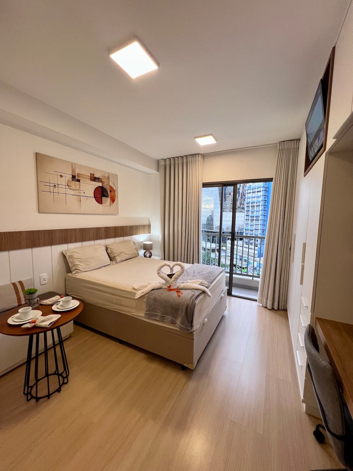 Preciós estudi amb una vista preciosa de la ciutat des del balcó, excepcionalment complet i planificat. Assegurança, amb conserge blindat les 24 hores. Allotja't a la planta 22 de l'edifici més proper al metro Faria Lima i a 3 estacions de l'Av. Paulista. Còmode i pràctic, llit doble extragran, llençols complets, oficina de 2 pantalles de 27', wifi ràpid, cuina ben equipada, TV60', dutxa potent i taula de menjador. També a l'edifici: piscina climatitzada amb jacuzzi, espai de cotreball, gimnàs obert les 24 hores i bugaderia. Mercat i bars fantàstics al costat!