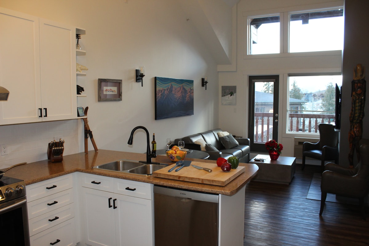 Amb estil, per anar a esquiar i tornar. Apartament d'1 dormitori a la planta superior de Cornerstone Lodge, amb vistes a la plaça. El Lodge és el més proper a TOTS els remuntadors de base a FAR. Ideal per a parelles/solters/famílies petites amb un llit king size. Aquesta és la nostra unitat, així que la hem configurat per al nostre ús. La cuina per cuinar, amb bons ganivets i estris de cuina i 4 tipus de cafetera. L'edifici disposa d'aparcament subterrani segur i climatitzat, banyera d'hidromassatge, gimnàs, armariet per a esquís i garatge subterrani. Perfecte per a una estada còmoda. Esglaons per accedir a les pistes d'esquí.