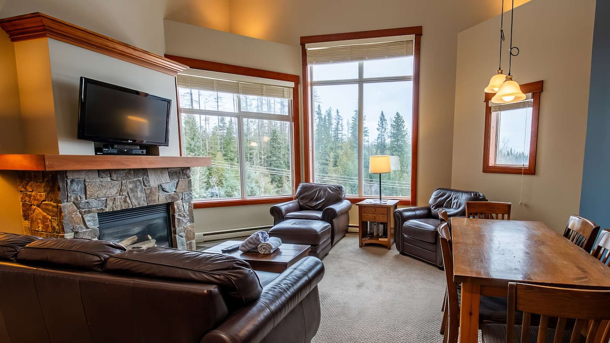 Aquesta tranquil·la suite de planta superior envoltada de vistes a la muntanya disposa d'una acollidora sala d'estar, llar de foc i sofà llit amb centre multimèdia per fer que la teva estada sigui agradable. El dormitori principal té un llit king size còmode. Tenim una cuina totalment equipada i bugaderia per a la teva comoditat. Gaudeix de l'accés a tots els serveis, com ara aparcament subterrani climatitzat, sala de fitness, piscina, banyera d'hidromassatge i sala de vapor. A només 5 minuts del turó i a poca distància a peu de restaurants i bars.