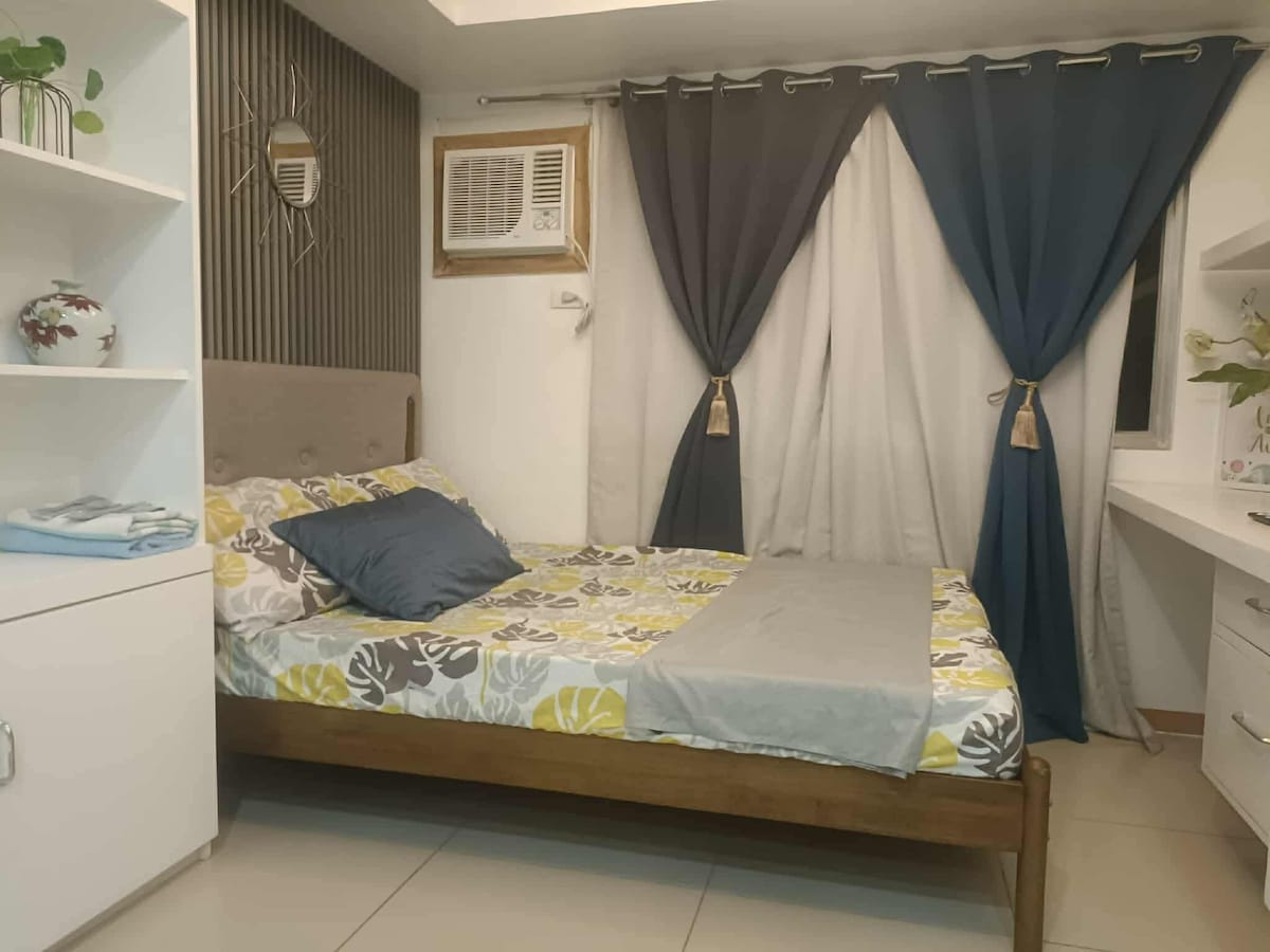 This minimalist and relaxing place is located in the center of Iloilo City and close to malls and must-see destinations(Casa Emperador, Molo church & plaza). This room has a queen size bed and offers "hotel-like" amenities such as 55-inch Sony TV, free wifi with fast internet speed, refrigerator, aircon, electric kettle, bidet with feminine and rear wash feature, water heater(hot shower), rice cooker, induction stove and cooking utensils. Swimming pool (2 persons) and gym are also available.