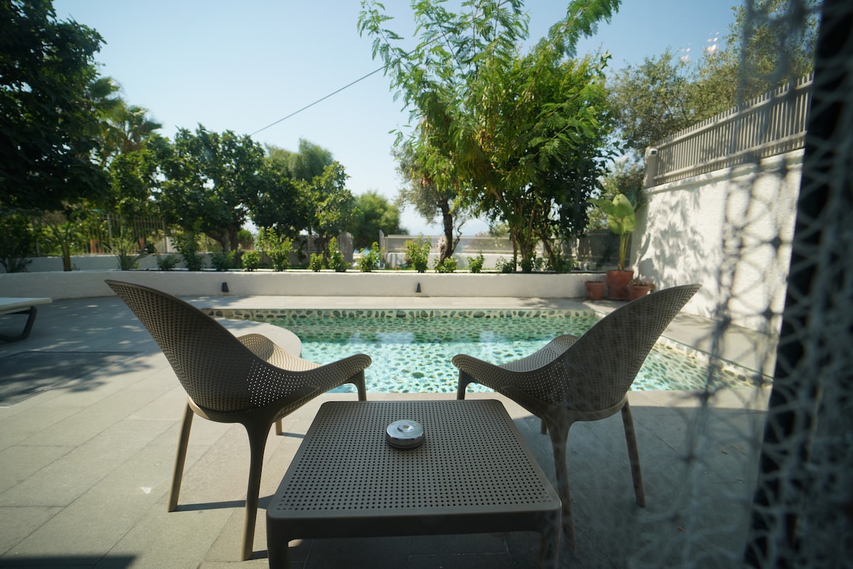 Es troba a 2 km del mar, la platja, a 1 km del mercat, a 10 km del centre de Fethiye i a 25 km de Ölüdeniz. Es troba a la zona de Fethiye Çiftlik. És una vil·la construïda el 2023, totalment moblada amb mobles moderns, amb piscina i jardí propis, i també un jacuzzi. Té un entorn tranquil per a la família i tenim una trona i un llit de parc per als teus nadons.