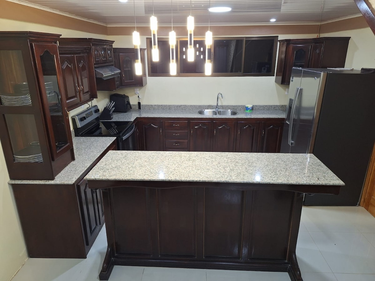 Relaxa't a Casa Dolly, una acollidora casa rural reformada en un jardí de 15 000 peus quadrats a Volcán, Chiriquí. Capacitat per a 8 persones (2 dormitoris interiors + 1 dormitori independent amb cobert). Cuina totalment equipada, televisor depantalla plana (per cable + streaming), rentadora, assecadora, aigua calenta i wifi de fibra de 400 Mbps, ideal per treballar a distància. Gaudeix de diverses zones d'estar a l'aire lliure, arbres fruiters, un petit galliner, un pati tancat segur i aparcament gratuït a l'allotjament. A cinc blocs (10 minuts a peu) del carrer principal, perfecte per a famílies i amants de la natura.