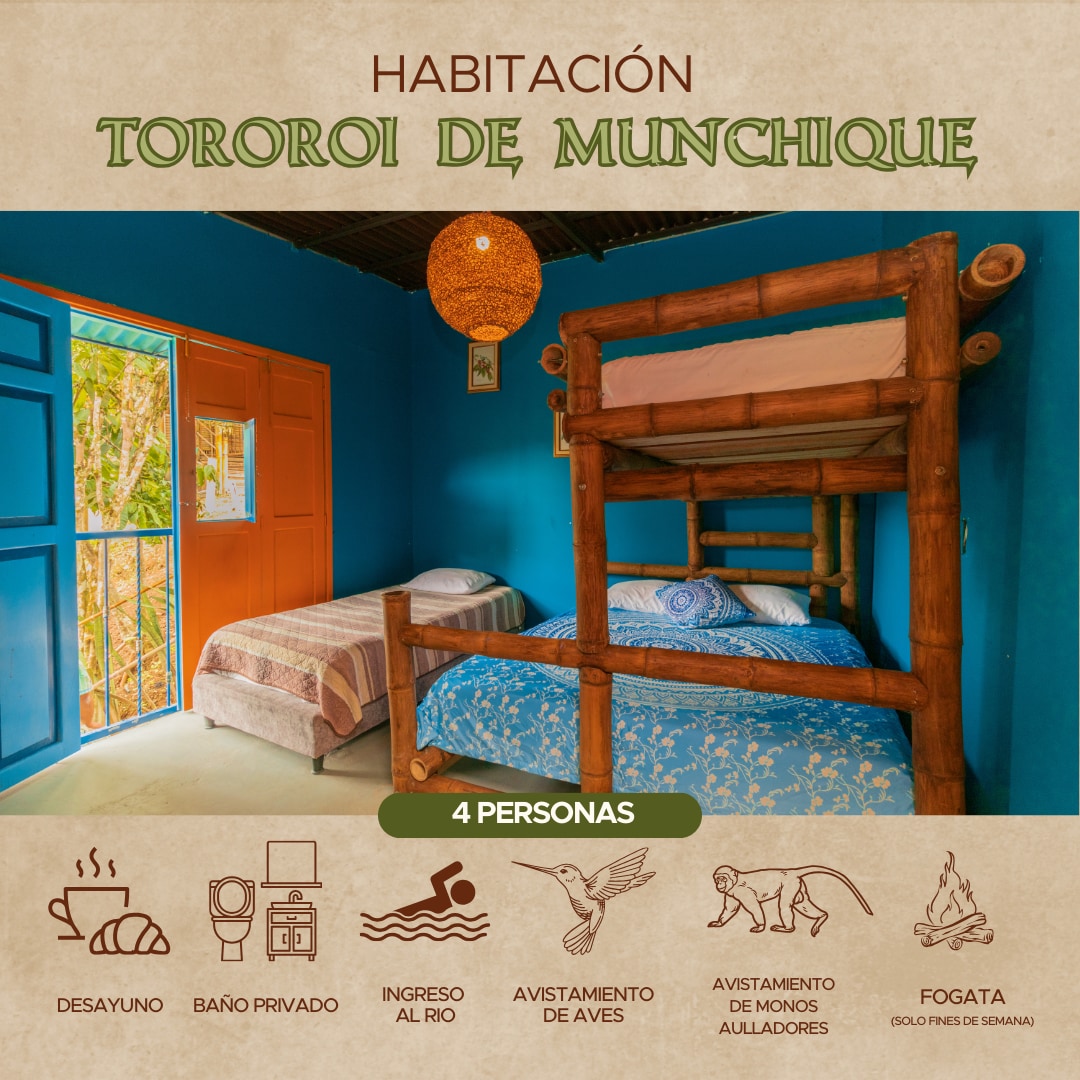 Aquí encontrarás: -Noches de fogata y estrellas -Ríos y senderos naturales -Jacuzzi, pileta térmica, sauna y turco -Piscina -Cancha de fútbol, básquetbol y zona de juegos -Gastronomía típica para disfrutar -Avistamiento del mono aullador y la rana de cristal Estamos a solo 20 minutos de Filandia, Quindío y a 10 min de Arabia, Risaralda Pregunta por nuestro tour para ver la rana de Cristal y tour a Termales del Ruiz