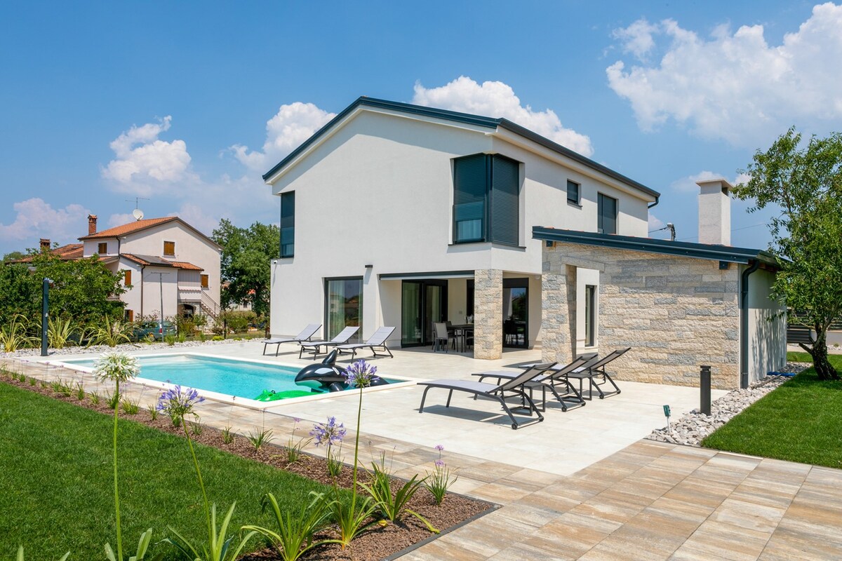 Villa amb estil a prop de Rovinj amb piscina digna de fotografia, banyera d'hidromassatge enfonsada i sauna. Desperta't amb unes vistes panoràmiques exuberants de la vall. Ideal per a parelles i famílies, a poca distància en cotxe del parc d'aventures, el parc nacional de Brijuni, el parc de dinosaures, pobles medievals i gastronomia local. És una autèntica escapada verda per a qualsevol persona que vulgui tornar a la natura amb tota la comoditat de la vida moderna. Totalment equipat per a la cuina i l'entreteniment en 2600 m2 de jardí (futbol, pilota de velocitat, bàdminton i diversió a la piscina) per gaudir dels teus fills i els teus estimats.